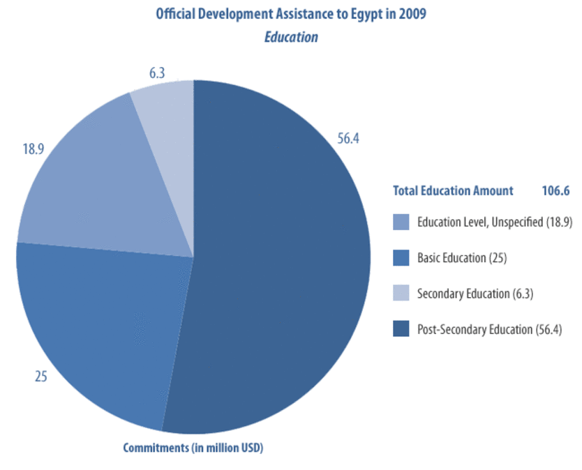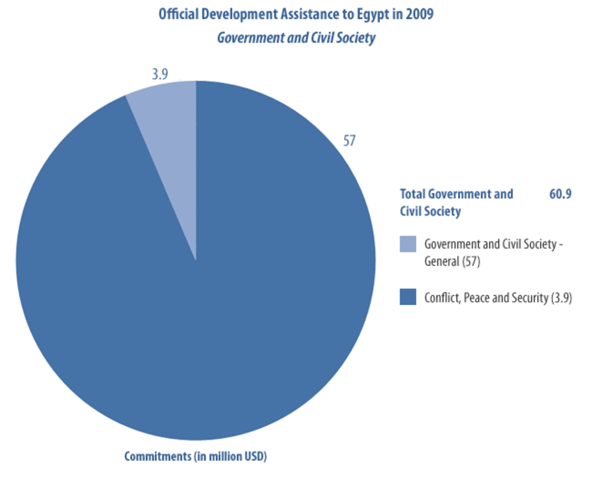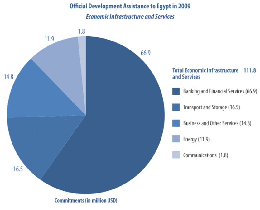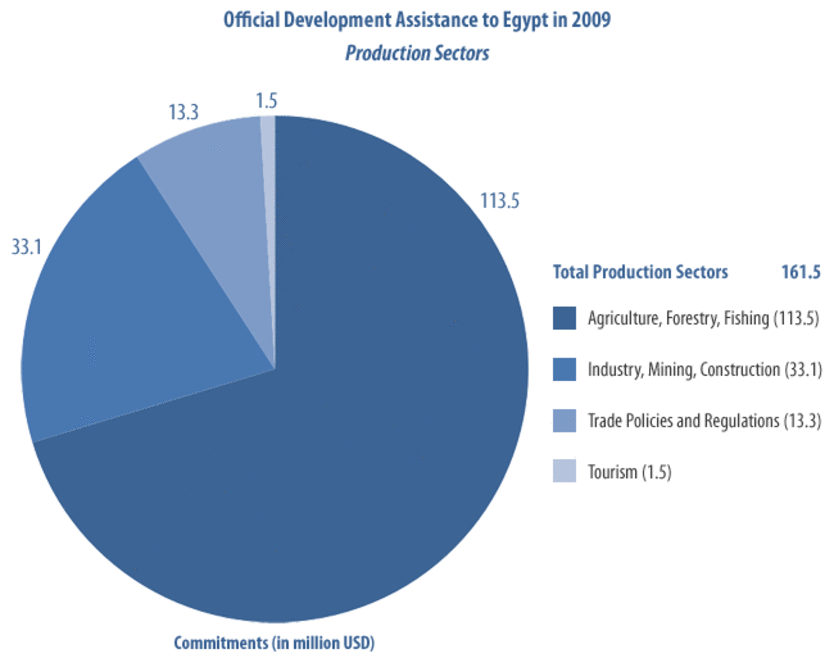 The graphs below show the amount of official development assistance for selected sectors in Egypt. Apart from these, significant ODA went to health (USD174.9 million), debt relief (USD 112.6 million), general environmental protection and other cross-cutting and multisector activities (USD87.8 millions), commodity aid and general program assistance (USD75.5 millions) and humanitarian aid (USD15.1 millions).