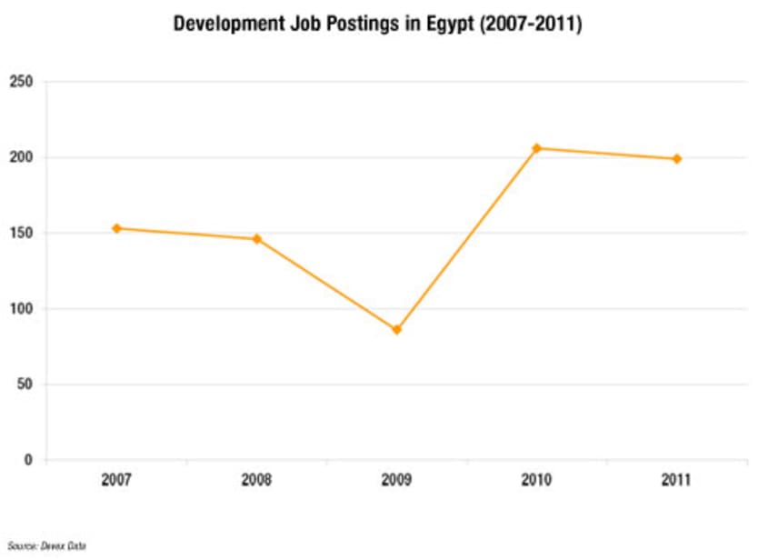 Devex jobs data suggests that most implementers in Egypt have indeed pressed ahead, likely with a lower profile. Devex has recorded only a slight drop in the number of development job openings in Egypt, from 206 jobs posted in 2010 to 199 in 2011 (see chart). Even as Abul-Naga’s crackdown on democracy groups intensified during the first half of this year, Devex recorded 104 job postings in Egypt over the same period.