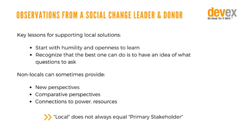 But Nundy pointed to the hard work social enterprises as well as philanthropists must do to stay locally relevant. Many successful organizations can begin locally, but then when larger institutional funders come in, they may become more distant from community voices as they scale, she said.