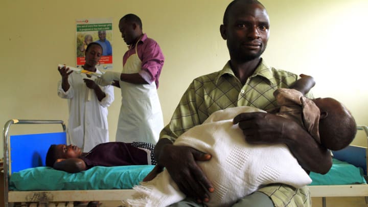 While her husband holds their youngest child, Twesigye Christente waits to receive a long-acting contraceptive at the Kinaaba Health Center II in Uganda. Photo by: UNFPA / CC BY-NC-ND