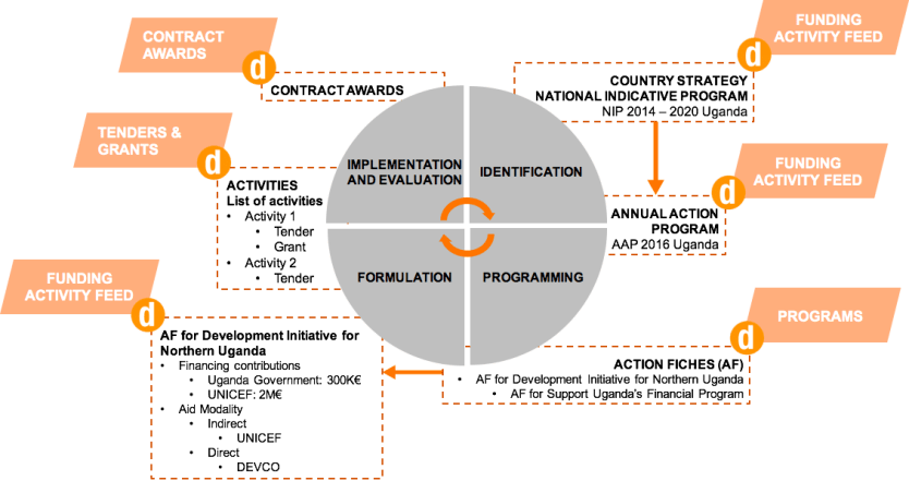An example of how the EuropeAid project cycle might flow in Uganda is illustrated below. In the chart, you can also see the types of funding data that EuropeAid’s project cycle generates in the dotted orange boxes, and where to find that data on Devex in the solid orange boxes.