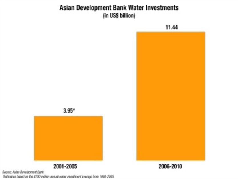In response, the Asian Development Bank launched in 2006 its Water Financing Program which aimed to increase the bank’s water investments between $2 billion and $2.5 billion annually to reach a total investment of $10 billion by the end of 2010. Under the WFP’s initial phase from 2006 to 2010, ADB’s water investments increased nearly three-fold compared to the previous five years. From an estimated $3.95 billion for 2001 to 2005, the bank’s water investments reached $11.44 billion for 2006 to 2010 – exceeding the $10 billion target.