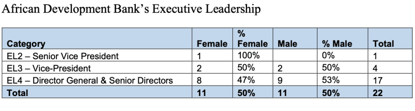 Devex, which first reported Kaba’s remarks, had cited the bank’s latest organigramme, which shows that three of AfDB’s eight vice presidents are women, along with six of the 15 people in other senior roles listed as reporting to bank President Akinwumi Adesina.