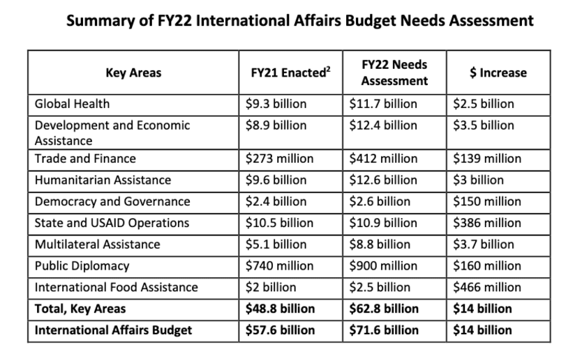 USGLC consulted with more than two dozen experts to develop a needs assessment for international affairs funding in light of the pandemic, which was shared exclusively with Devex. The number the organization came up with was an additional $14 billion above what was enacted for fiscal year 2021, excluding emergency funding that has since been added. That would amount to $71.6 billion for the international affairs budget in 2022.