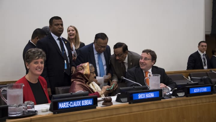 U.N. Development Programme chief Achim Steiner (center right) and Bangladesh Prime Minister Sheikh Hasina (center left) during the special high-level ministerial event, “Creating a Policy Vision for SDG Finance: Facilitating Private Sector Investment in the SDGs” held at the United Nations headquarters in New York on Sept. 20, 2017. Photo by: Freya Morales / UNDP / CC BY-NC-ND