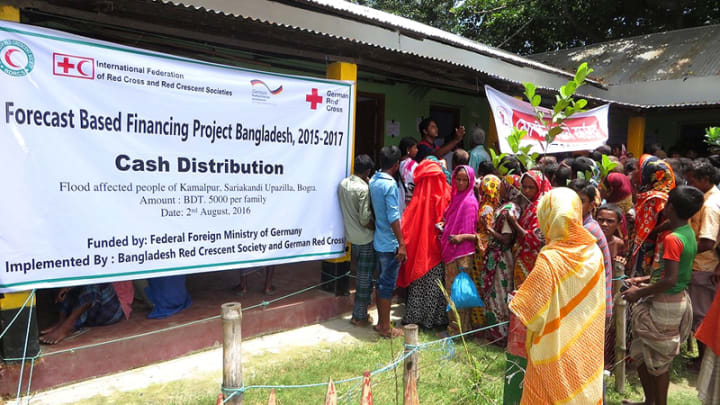 In the Bangladesh pilot, that country’s Red Crescent distributed about $60 — the equivalent of one month’s average salary — to 1,039 households shortly before the flooding of the Bramaputra river last summer. IFRC says surveys it carried out after the event found that, by using the money to buy fodder or move their animals to safer locations, 40 percent fewer households lost, or were forced to sell, livestock compared to households that did not receive payments; and 50 percent fewer households took out high interest loans to cope with the floods.