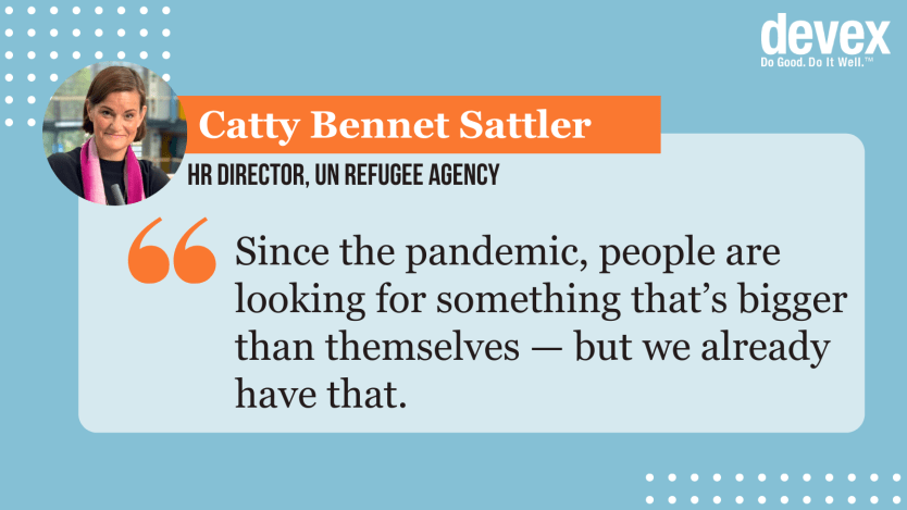 • Purpose-driven work. Many in the development sector are driven by cause rather than pay. “If you work on the really courageous issues — like environment, children, labor rights, migration, refugees, food security — these do have a strong value proposition,” says Michael Emery, the HR director at the International Organization for Migration.