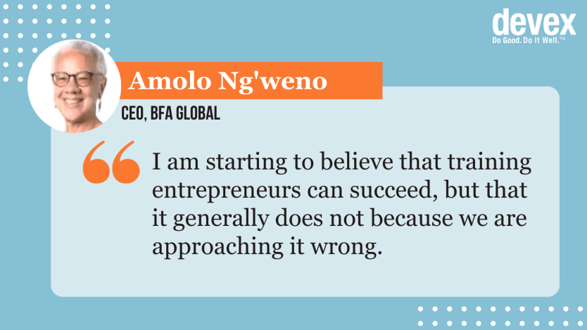 Ng’weno has been tempted to write off entrepreneurship training altogether, but three projects at BFA Global, the development firm that she leads, have led her to wonder whether the real problem is how they’re doing the training.
