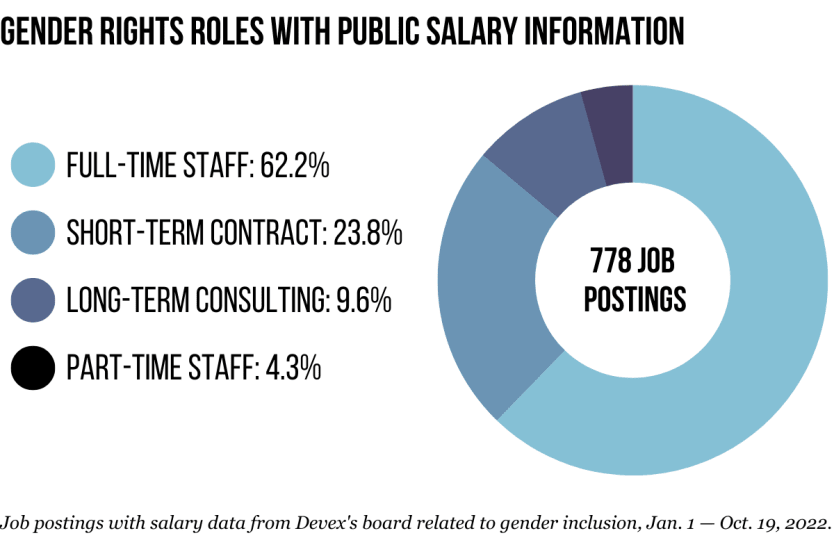 Devex is continuing to encourage recruiters to include salary information in their job postings. Of the 778 jobs with public salary data related to gender inclusion posted on our board so far this year, over 60% are for full-time positions.