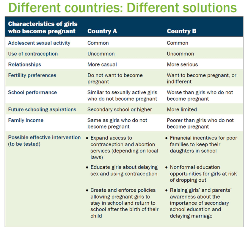 In Country A, effective interventions would expand access to contraception and abortion services (depending on local laws) for adolescent girls, including educating girls about rights and gender norms, delaying sex and using contraception. Creation and enforcement of policies allowing pregnant girls to stay in school and return to school after the birth of their child may also improve girls’ education in these settings.