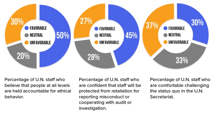Fewer than half of U.N. staffers surveyed in a 2018 staff engagement survey, conducted by a private contractor, have said they believe they would receive protection if they report harassment or abuse. U.N. chief António Guterres has also acknowledged that the number of reported harassment and abuse cases is likely an underestimate.