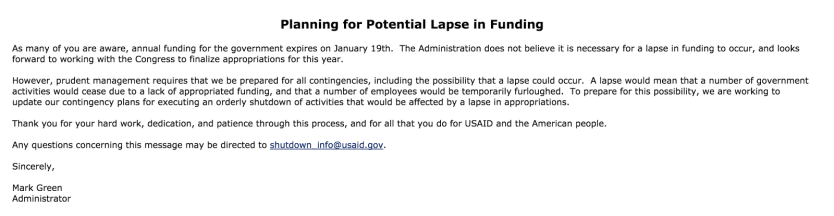 Even though this shutdown turned out to be short lived, multiple USAID staffers shared frustration with the agency’s communication — or lack thereof — in the days and hours leading up to it. By mid-afternoon on Friday, many employees still had not heard from their supervisors what to do in the event of a shutdown, one USAID employee told Devex on the condition of anonymity.