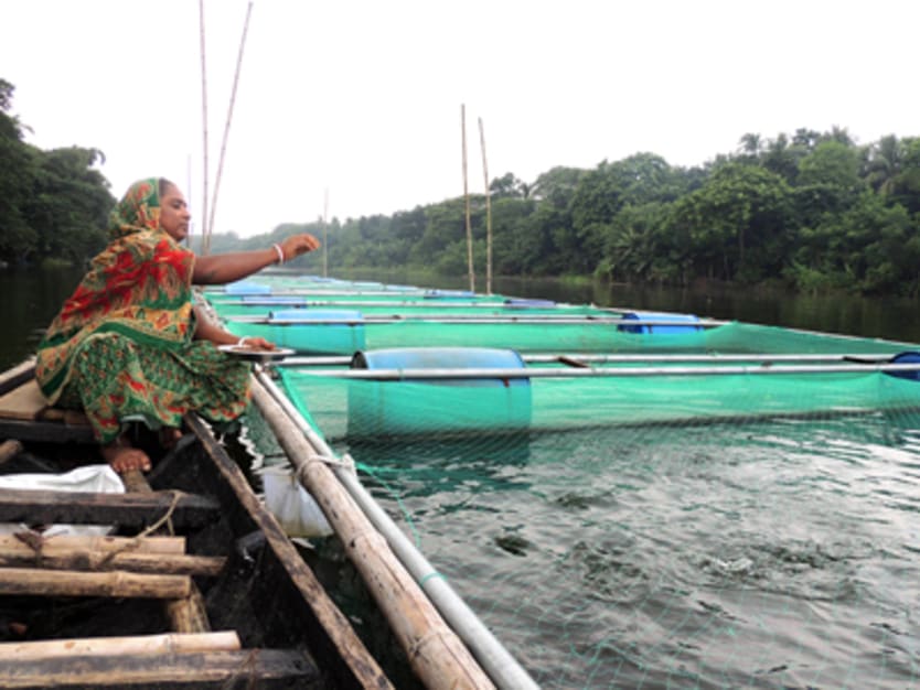 A woman feeds fish in Bangladesh. According to the Food and Agriculture Organization, 30 percent of the world's fish stocks were over-exploited, depleted, or recovering in 2009. Photo by: WorldFish / CC BY-NC-ND