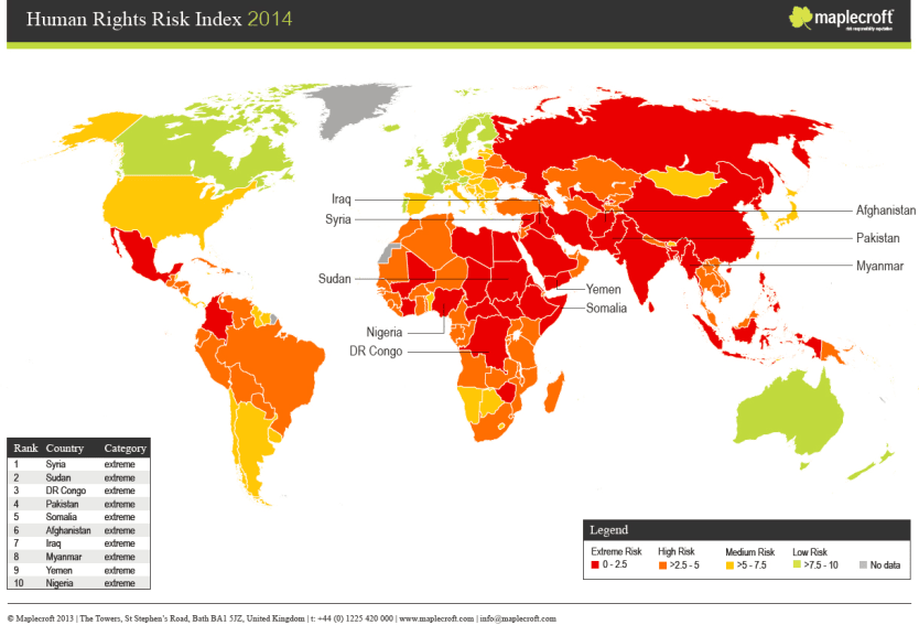 In its Human Rights Risk Atlas 2014 report, global risk and strategic consulting firm Maplecroft ranked 197 countries according to the threats to human security, restrictions on civil and political rights, discrimination, and widespread immunity, among other factors.