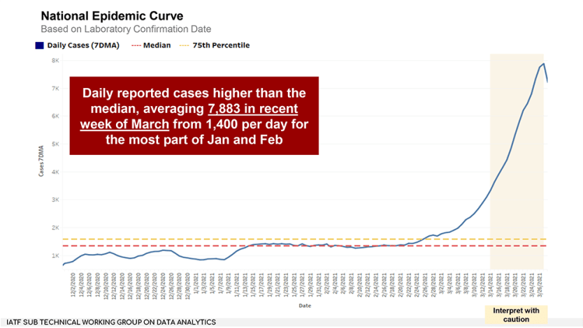 The Philippines has seen a rise in COVID-19 this month — largely in the capital and some nearby provinces — with an average of more than 7,800 new cases per day in the past week. This marks a significant jump from the average of more than 2,000 cases per day during the final week of February. On Monday, the country recorded over 10,000 new cases, bringing the national total to nearly 732,000 cases since the start of the outbreak.