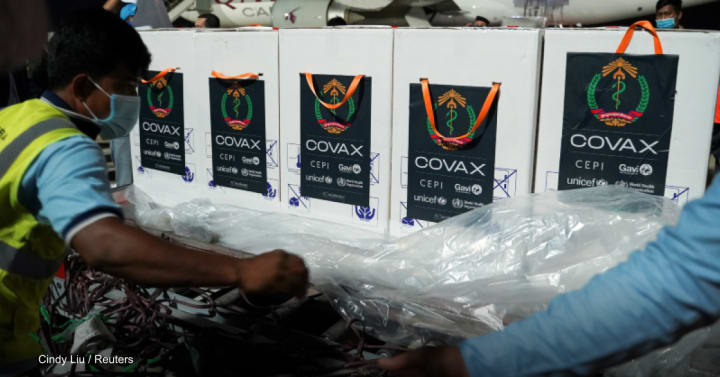 Workers offload boxes of COVID-19 vaccines distributed under the COVAX scheme at the Phnom Penh International Airport in Cambodia. Photo by: Cindy Liu / Reuters