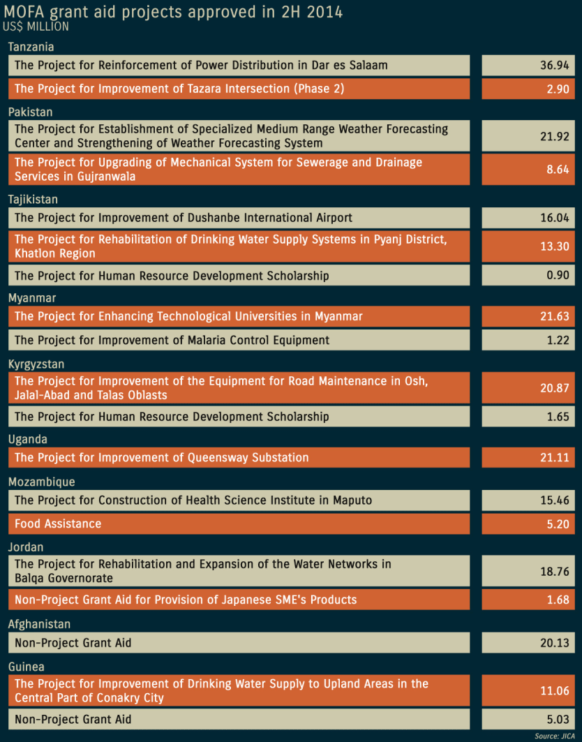 For the second half of 2014, Japan’s Ministry of Foreign Affairs approved 12.07 billion yen ($101.17 million) in grant financing for energy and water projects, boosting support for the sectors.