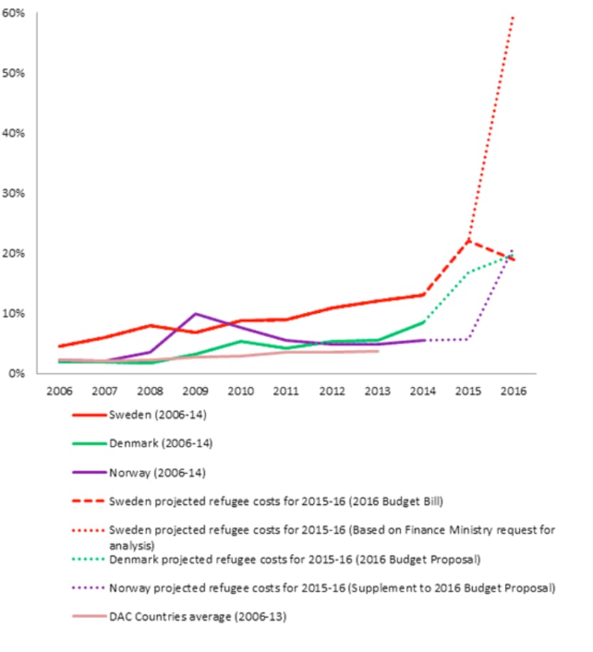 Its neighbor, Norway, usually among those at the top of the class with 0.98 percent of GNI, is also considering making a bigger proportion of aid available for internal refugee costs. The government recently proposed spending up to 21 percent of its aid budget on refugees in Norway and cutting its long-term development aid for the poorest countries by a massive 18 percent.