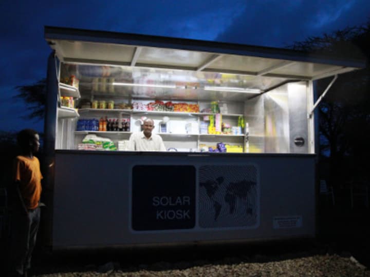 The kiosk looks like your regular store, selling refreshments and other products. But it has more to offer, from mobile charging to a solar fridge that can store food and medicines. It even has potential to get a telecom tower running.