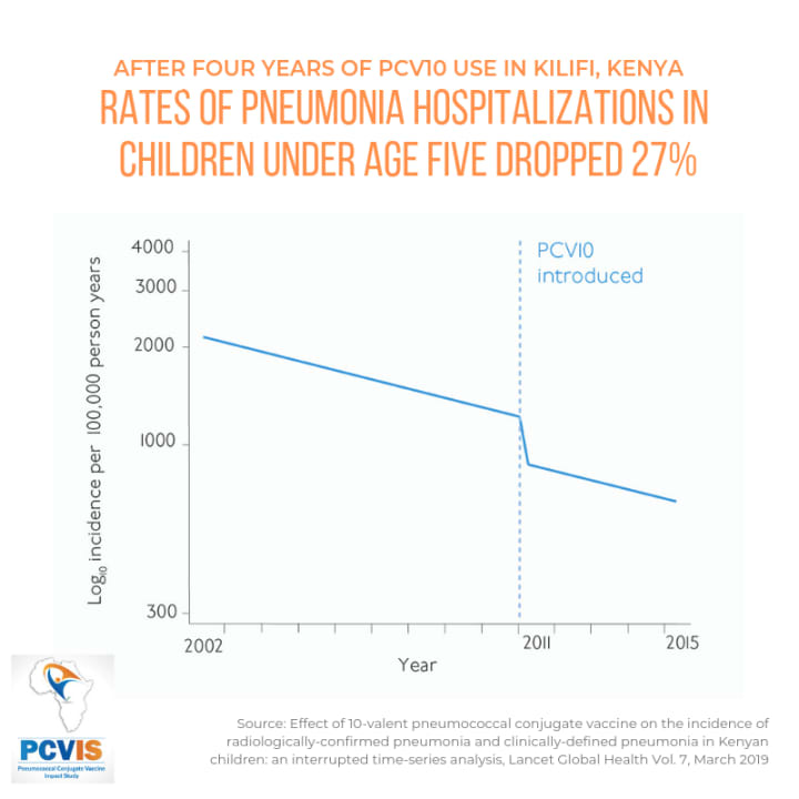 8. Evidence of strong impact mounts across Africa. PCV’s effectiveness in high-income counties has long since been demonstrated, and now we can see the value in low-income countries. The incidence of serious pneumococcal disease in Kenya caused by vaccine-type strains dropped by 92 percent among children under 5 years of age, and PCV reduced all pneumonia hospitalizations by more than one-quarter.