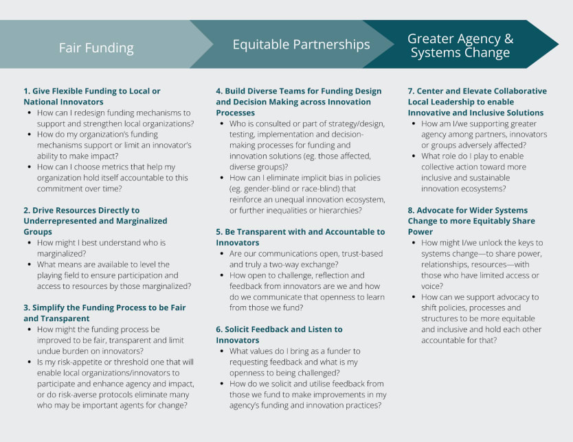 —The outcome is the Equity Principles and Metrics Framework for Meaningful Localization, co-created and tested with nearly 200 country-based innovators, change-makers, and activists from Africa, Asia, Latin America, and the Caribbean representing diverse grassroots, local, national, regional, and global organizations. The framework highlights three interconnected themes: fair funding practices, which contribute to more equitable partnerships, which in turn contribute to greater agency of local change-makers to secure systems change. Under these three themes, the framework presents eight principles prioritized by change-makers for power-sharing, recommended institutional and individual actions for donors and desk officers, and tangible metrics for accountability.