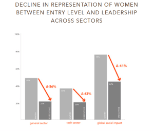 But, then we compared the percentage of the workforce that is female at entry-levels versus the percentage of leadership that is female. When we did that, we found that international development is actually not doing so well. For example, in tech, there is a 43 percent decline of women from entry-level to leadership levels; in international development, it’s a 41 percent decline. The reason? International development has a much larger female entry-level workforce than other sectors.