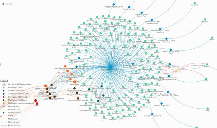 By visualizing climate finance networks across 45 wealthy countries, 143 countries in the developing world, and 65 financial institutions, it is easier for investors to supercharge impact hubs — clusters of governmental and private investors.