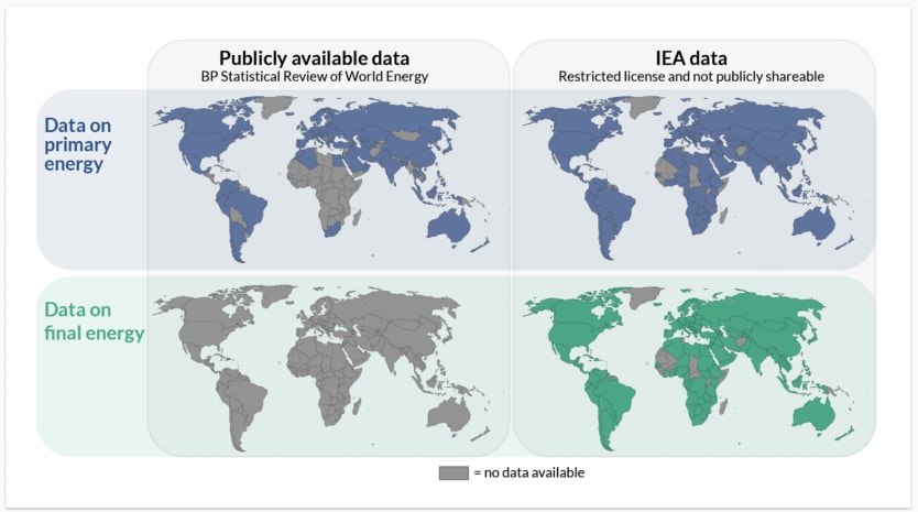Comprehensive country-level data on “primary energy” — or energy as it is first extracted from nature, like coal from the ground — is simply not publicly available for many countries in Africa and Asia. Meanwhile, country-level data on “final energy” — or the form of energy delivered to consumers for actual consumption, like electricity to your house — is not publicly available across the globe. This information is only available through IEA’s closed datasets.