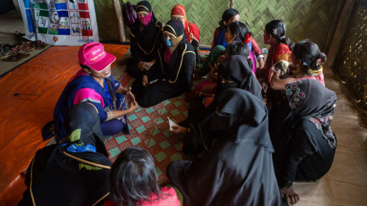 In a brightly decorated women-friendly center at the Kutupalong Extension camp in Lambasia, about an hour’s drive north of Cox’s Bazar in southern Bangladesh, Rohingya refugee women and girls of all ages gathered in a semi-circle around a staff member leading a group discussion.