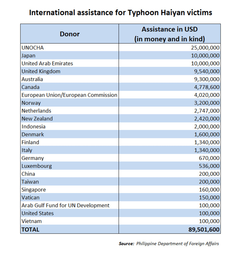 Leading the pledges is the U.N. Office for Coordination of Humanitarian Affairs with $25 million, while Japan and the United Arab Emirates share the second spot with $10 million. Other top donors are Australia and the United Kingdom, with more than $9 million each, according to the latest data posted by the Philippine Department of Foreign Affairs.