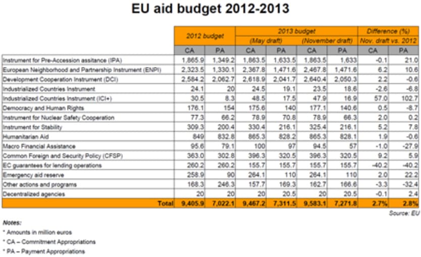 Aid spending under the new proposal is not much different from the one released in May. Compared with the 2012 budget, more money would be spent on EU neighbors and countries eager to join the regional bloc. The allocation for the Development Cooperation Instrument was revised from €2.62 billion to €2.64 billion. Commitments to humanitarian assistance and emergency aid reserves are slightly higher as well: €865.3 million and €264.1 million, respectively.