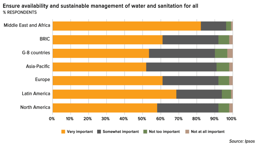 In a recent survey conducted by Ipsos, a broad base of citizens in different countries was asked to prioritize each of the 17 SDGs. As you will see, health, water and sanitation remain important priorities for the public.