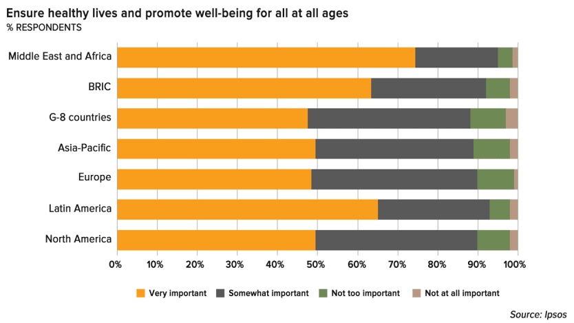 Overall, citizens consider the health SDG important. On average, 90 percent responded that they considered it either very or somewhat important. In reviewing the “very important” response only, however, regions with greater numbers of developing countries — Middle East and Africa, and Latin America — reported that health was very important at 74 and 65 percent respectively, while the lowest ratings for health as a very important priority were from Europe and the G-8 countries, tied at 48 percent.
