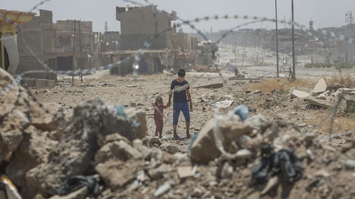 Two siblings walk in an area near Mosul’s front line. Photo by: Peter Biro / European Commission / CC BY-NC-ND