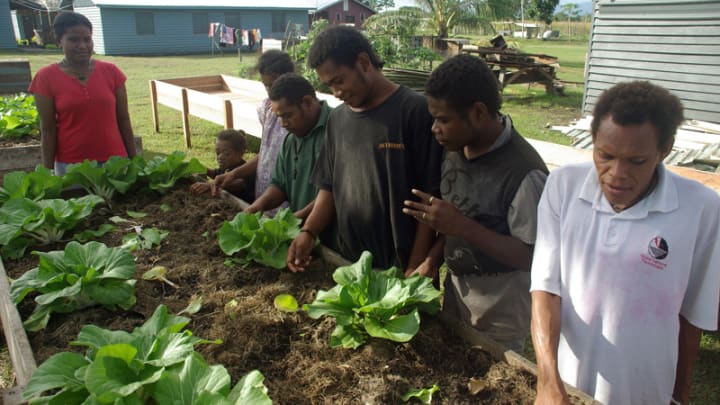 Bethesda agriculture studies teacher Thelma Awasi supervises weeding in the specially designed wheelchair accessible garden beds in the Solomon Islands. Photo by: Irene Scott / DFAT / CC BY