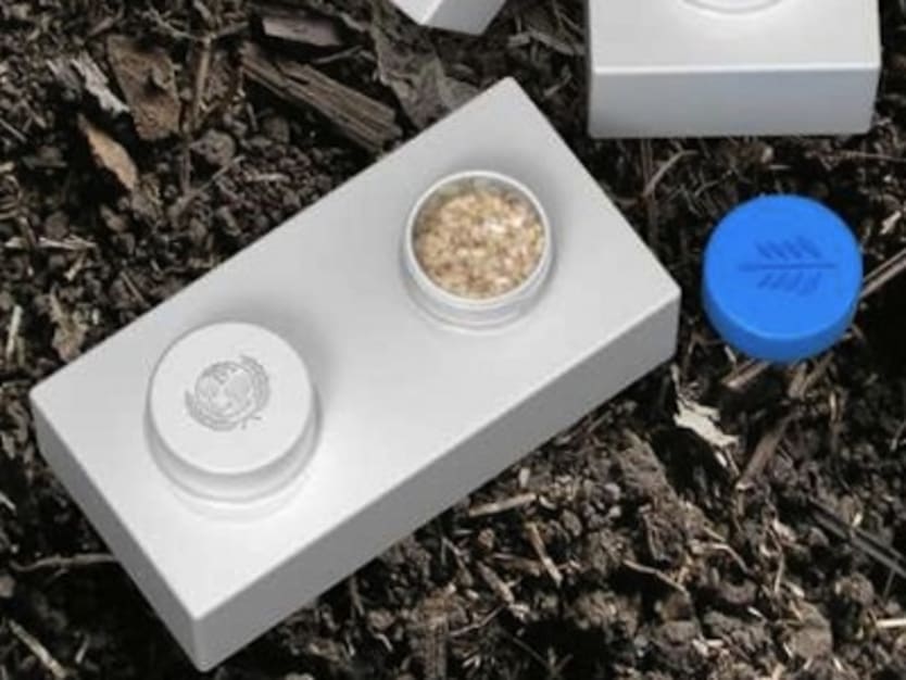 The idea behind this so-called UNICEF brick: Used to distribute food and water in humanitarian emergencies, the bricks may later be filled with soil and sand, and stacked together to form a temporary shelter.