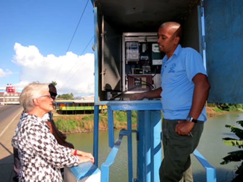 Integrated water resource manager Vinesh Kumar (right) shows Margareta Wahlström (left), United Nations special representative of the Secretary-General for disaster risk reduction how a water monitoring station on the Nadi river works and serves as an early warning system in Fiji. Wahlström is in the country for the first joint meeting of the Pacific Platform for Disaster Risk Management and Pacific Climate Change Roundtable. Photo by: UNISDR / CC BY-NC-ND