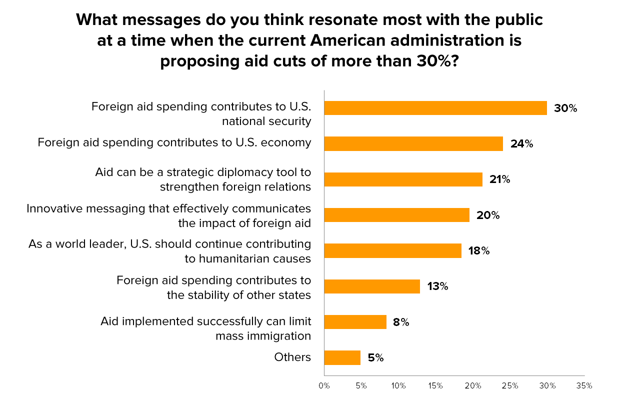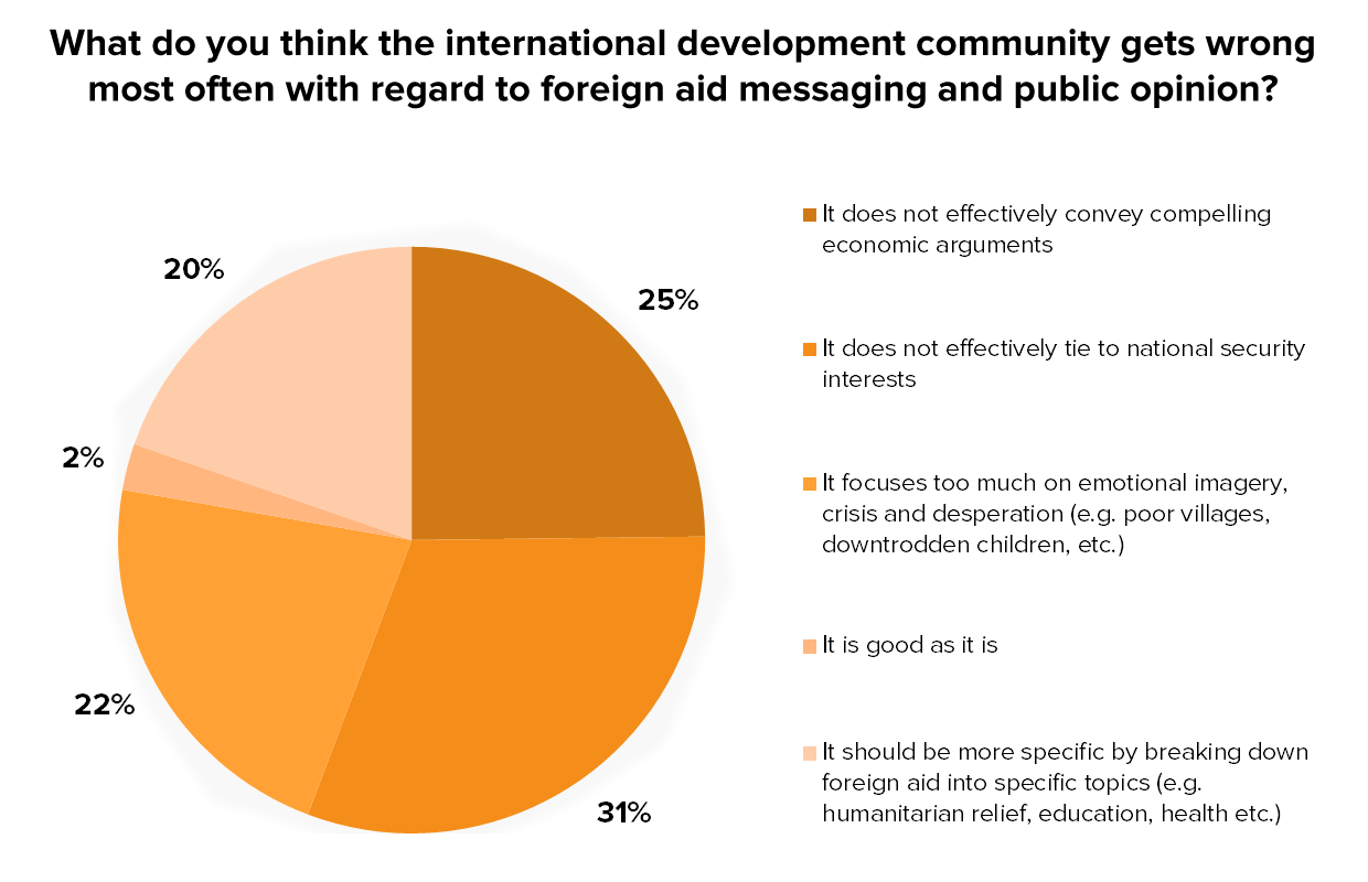 Notably, according to our survey, there was almost universal recognition that the status quo is not working with aid messaging. Only 2 percent of respondents among these development leaders felt that the development community is getting the messaging right on foreign aid, a remarkable collective realization that approaches to date have not yielded the hoped-for results. This is highly encouraging.