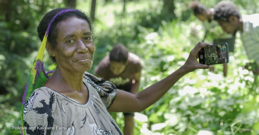 A woman in Morobe province in Papua New Guinea, holding a mobile device to film her story. Photo by: Folktale and Kalolaine Fainu