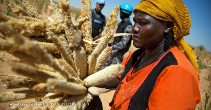 A farmer collecting millet in a land rented by a community leader in North Darfur, Sudan. Photo by: Albert Gonzalez Farran / UNAMID / CC BY-NC-ND