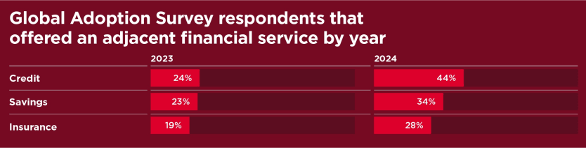In 2024, more mobile money providers, or MMPs, were offering access to credit, savings, and insurance products than the year before. These figures show an ongoing trend where MMPs are going beyond their typical payments use cases by offering what’s known as “adjacent services.”