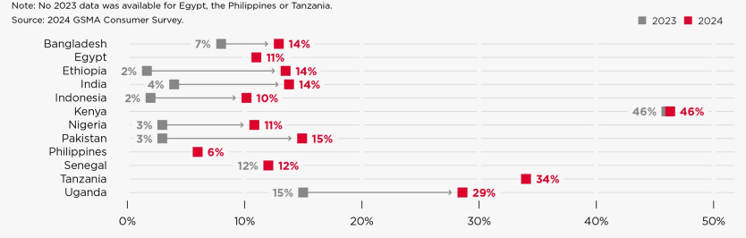 Customers who used mobile money to take out a loan in the past 12 months by country, 2023 and 2024. Source: GSMA’s The State of the Industry Report on Mobile Money 2025