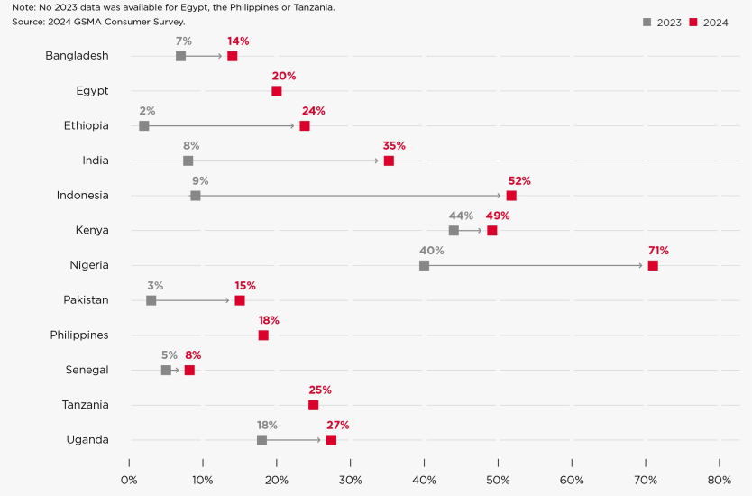 For the first time, the GSMA noted this trend across selected markets based on consumer data collected in 12 markets in Africa and Asia: Bangladesh, Egypt, Ethiopia, India, Indonesia, Kenya, Nigeria, Pakistan, the Philippines, Senegal, Tanzania, and Uganda. Our analysis showed that a rising number of customers in Asia and sub-Saharan Africa had used mobile money to take out a loan in 2024, compared to 2023. In markets such as Ethiopia, India, Pakistan, and Uganda, this year-on-year increase was over 10 percentage points.