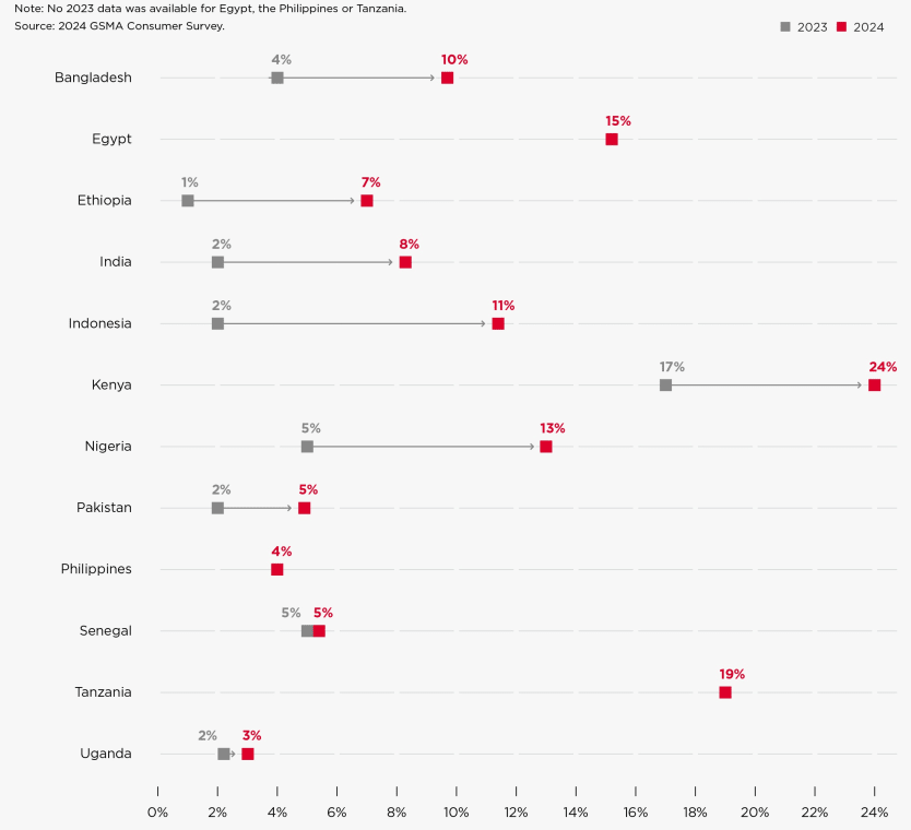 Customers who used mobile money to pay for an insurance product in the past 12 months by country, 2023 and 2024. Source: GSMA’s The State of the Industry Report on Mobile Money 2025