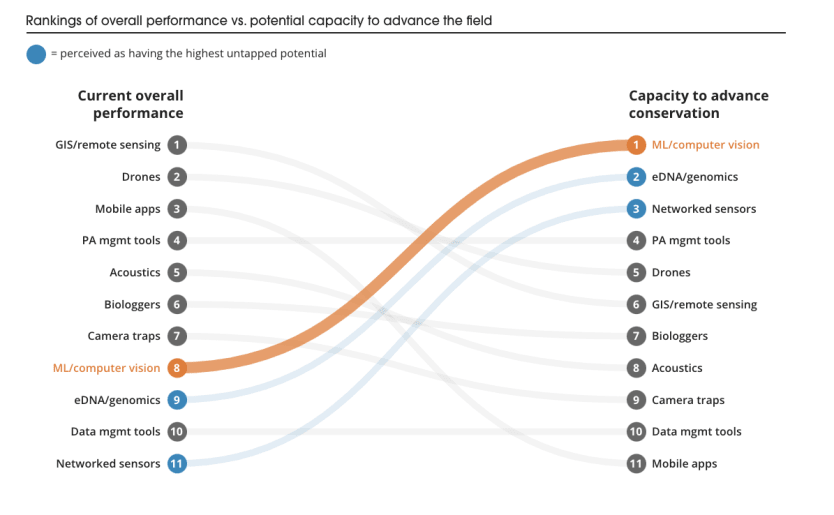Our data shows that evolving tools such as machine learning, environmental DNA, and networked sensors rank as the conservation technologies with the highest potentials for future impact. However, our data also shows that common challenges within the field, such as limited funding, inadequate capacity building, and steep learning curves may limit users from meeting that potential if not addressed openly and collaboratively.