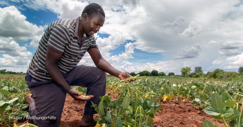 Stanford Munyayi, a farmer from South Gokwe, Zimbabwe, showcases his cowpea production. Through a Welthungerhilfe-supported Agricultural Business Center, he managed to take production to commercial scale. Cowpea is a climate-smart opportunity crop that is rich in folate, riboflavin, and zinc — three of the most underconsumed micronutrients in Zimbabwe. Photo: Brazier / Welthungerhilfe
