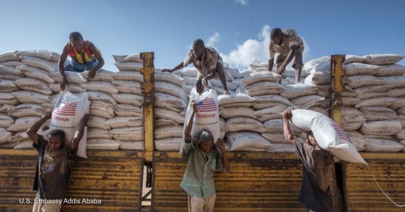 Sorghum bags are dispatched to drought-affected areas in the Somali region of Ethiopia in 2015. Photo by: U.S. Embassy Addis Ababa