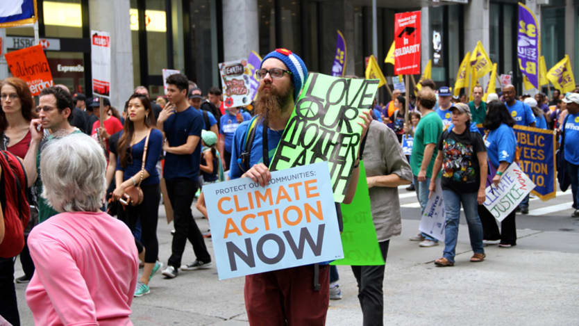 A man holds a banner urging climate action at a march attended by over 30,000 people on Sept. 21, 2014, in Melbourne, Australia. What is the U.N. Development Program doing to ensure that an ambitious agreement will be reached during the U.N. climate conference to be held in December in Paris? Photo by: Neah Monteiro / CC BY-NC
