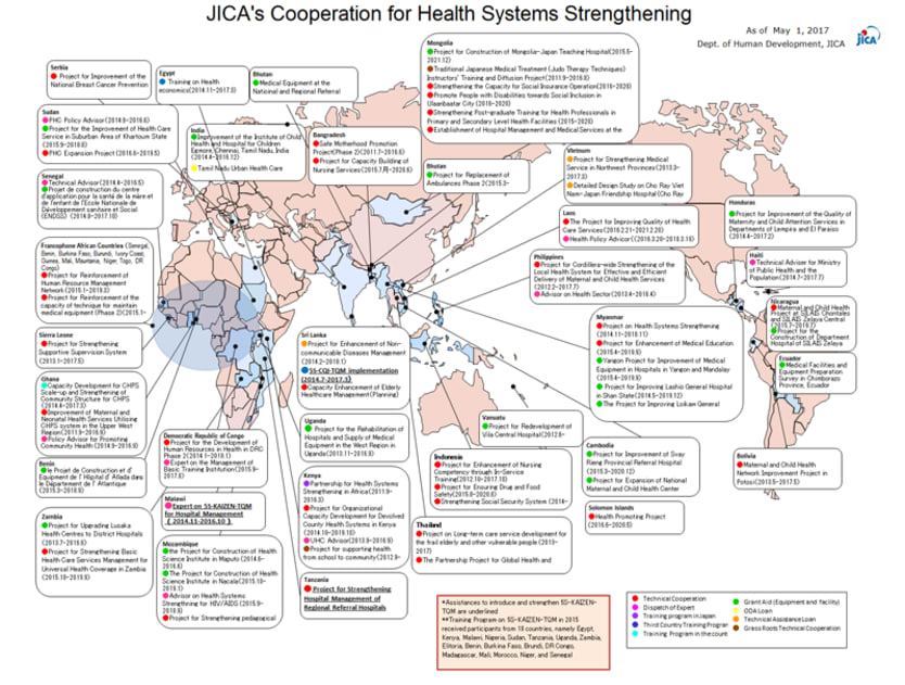 An overview of JICA’s current health aid still contains infrastructure-focused grants, such as the construction of a teaching hospital in Mongolia and the improvement of medical equipment in Myanmar’s hospitals in Yangon and Mandalay. But also apparent are projects focused on improving the quality of health services, strengthening health systems and building the capacity of institutions and health workers, including specialists in infectious diseases.