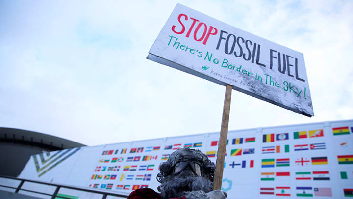 An environmental activist protests against fossil fuel in front of the venue of the COP24 U.N. Climate Change Conference 2018 in Katowice, Poland. Photo by: REUTERS / Agencja Gazeta / Grzegorz Celejewsk